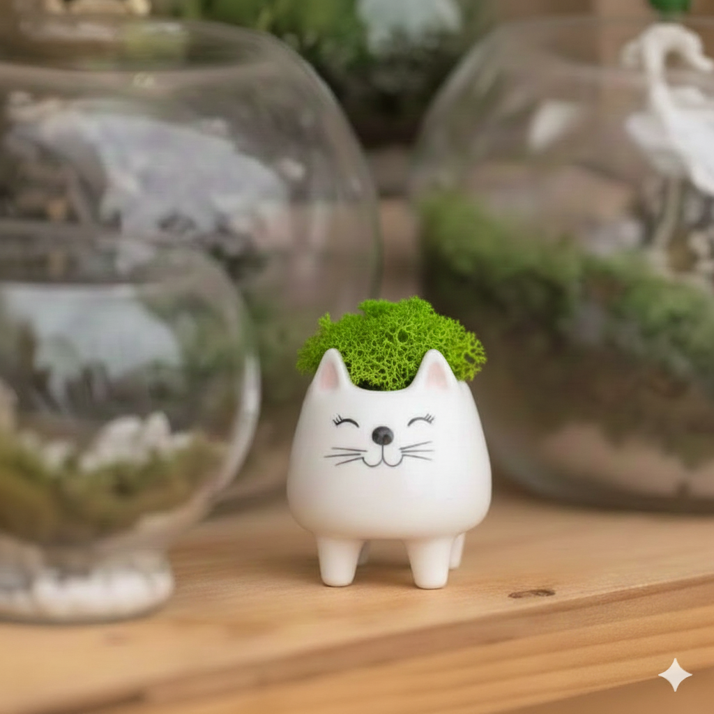 Este adorable gatito está hecho 100% con musgo natural preservado, un material ecológico que no necesita riego, luz ni mantención. Suave al tacto, verde todo el año y perfecto para decorar escritorios, repisas, entradas o rincones especiales que necesitan vida… pero sin complicaciones.