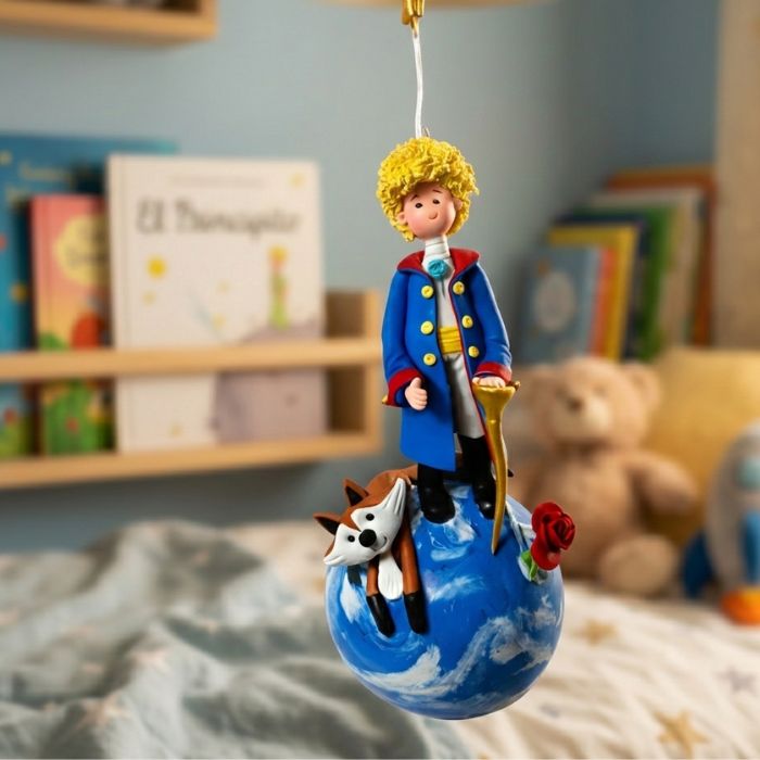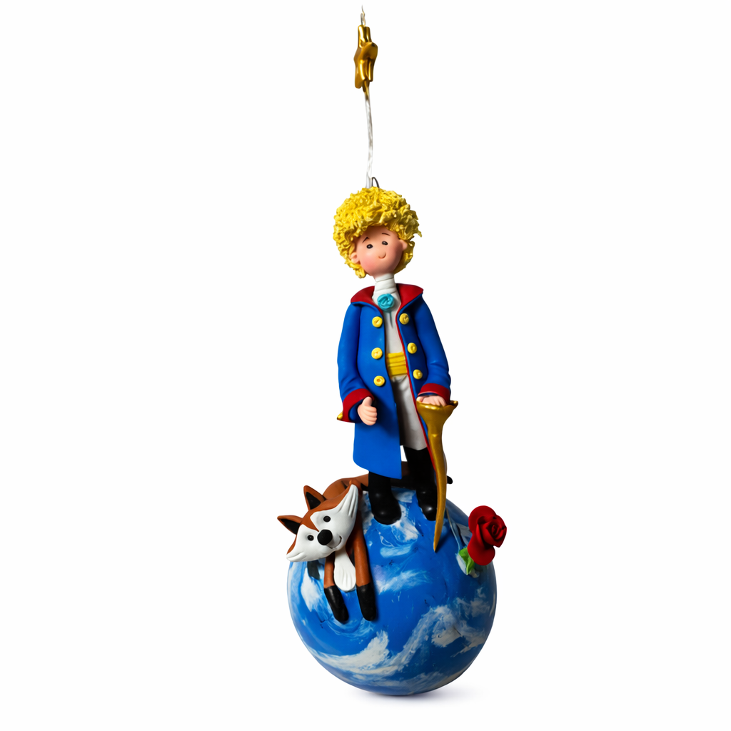 Este delicado Principito colgante, modelado completamente a mano en cerámica en frío, representa al icónico viajero de los pequeños planetas de la historia que ha inspirado generaciones. De pie sobre su pequeño mundo, acompañado de su rosa y su inseparable zorro, evoca la magia de la infancia, la amistad y la conexión con lo esencial.